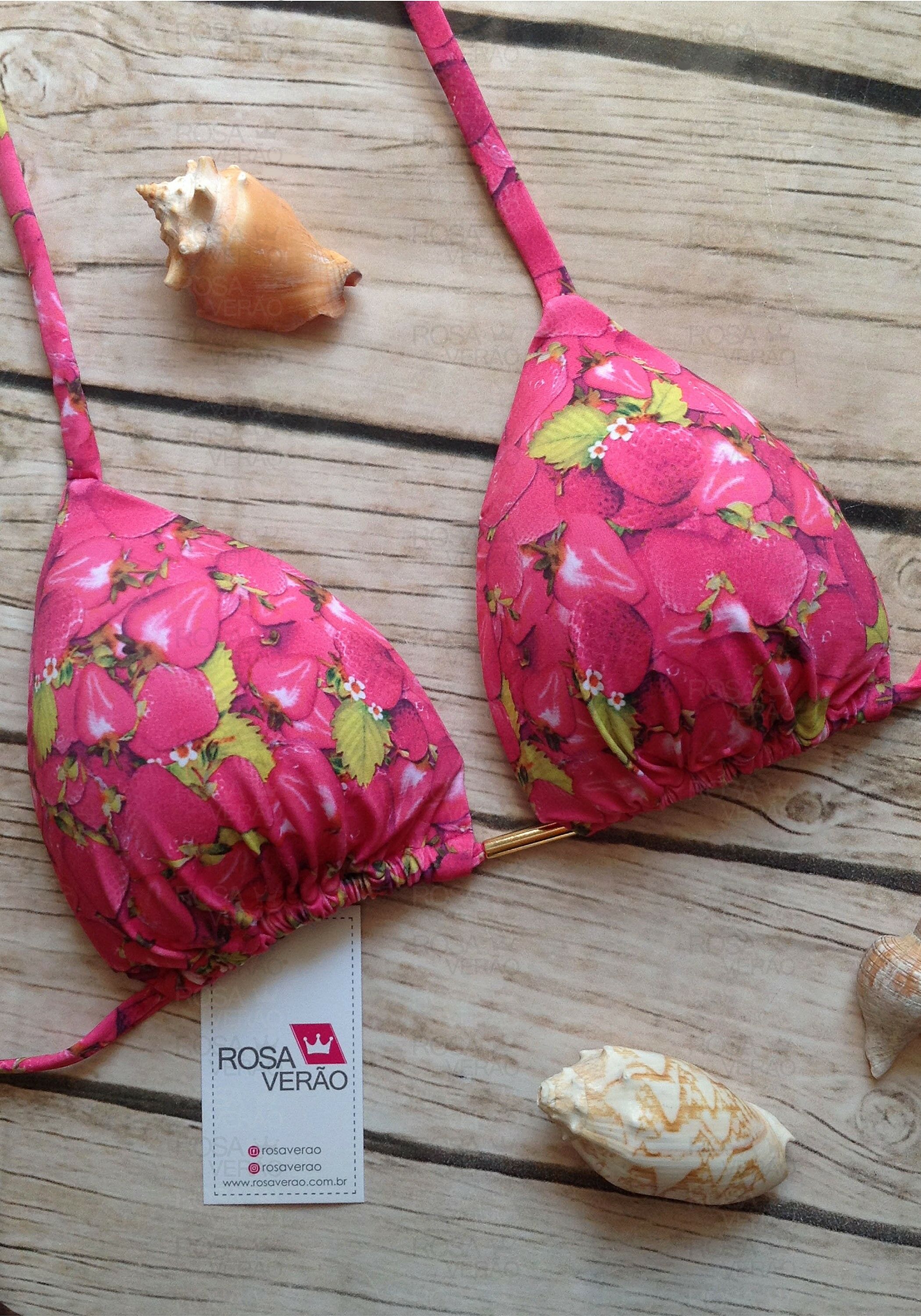 Biquíni empina bumbum modelo lacinho estampa moranguinho. Top com acessório banhado a ouro e bojo removível desenvolvido para realçar o seio de forma natural.