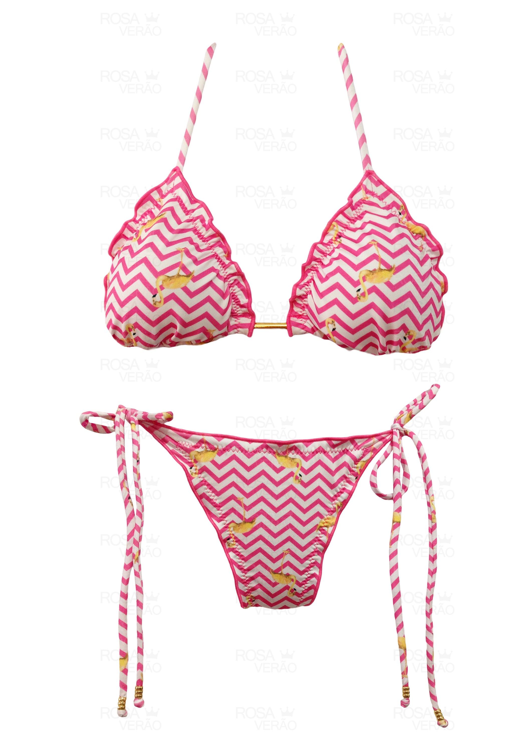 Biquíni cortininha ripple/ruffle empina bumbum estampa de flamingos com amarrações laterais. Confeccionado com tecido da mais alta qualidade, com proteção dos raios UVA/UVB e com forro especial que não deixa entrar areia no biquíni. Possui acabamento em fru-fru, bojo removível desenvolvido para realçar o seio de forma natural, além de acompanhar acessórios banhados a ouro.