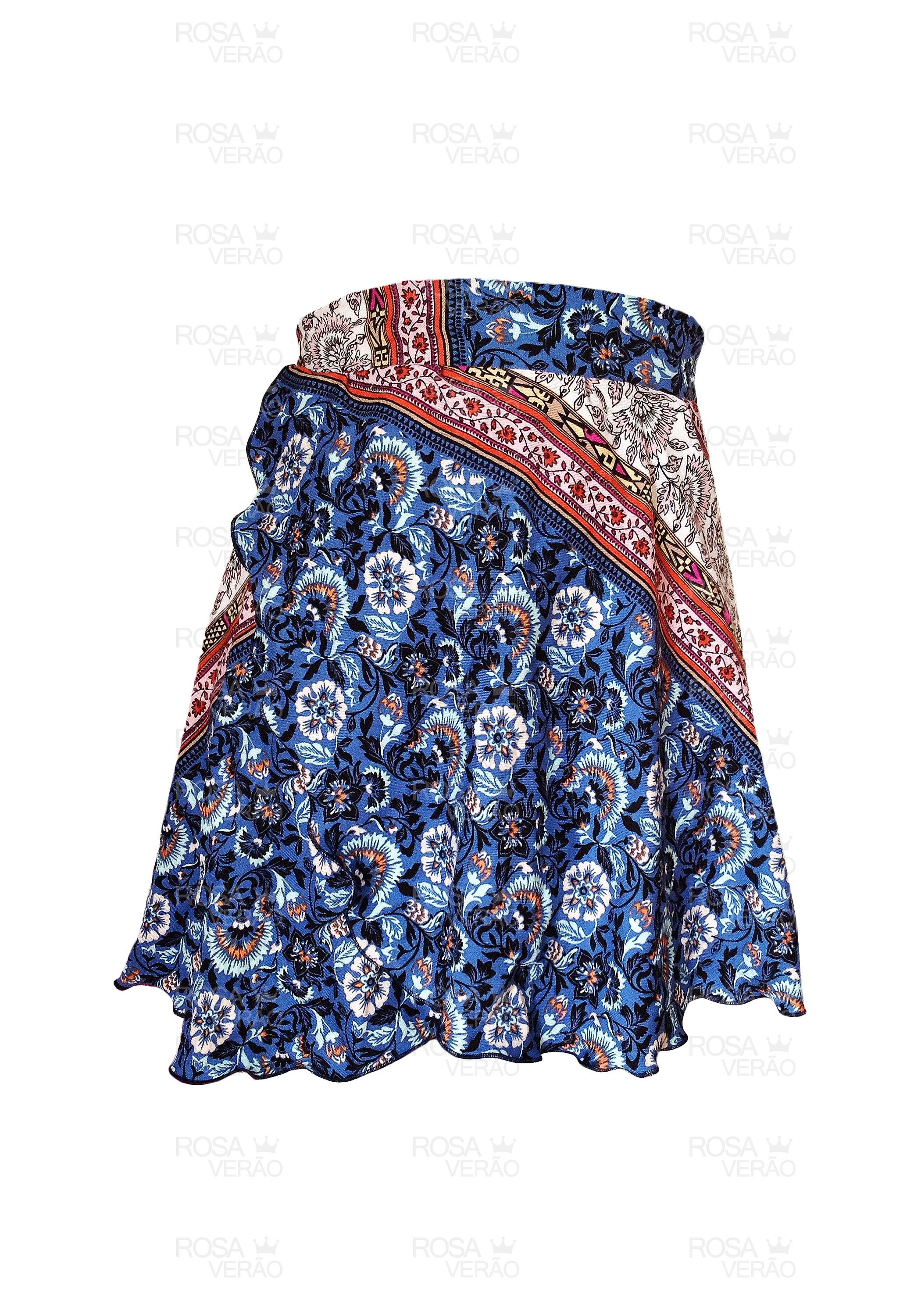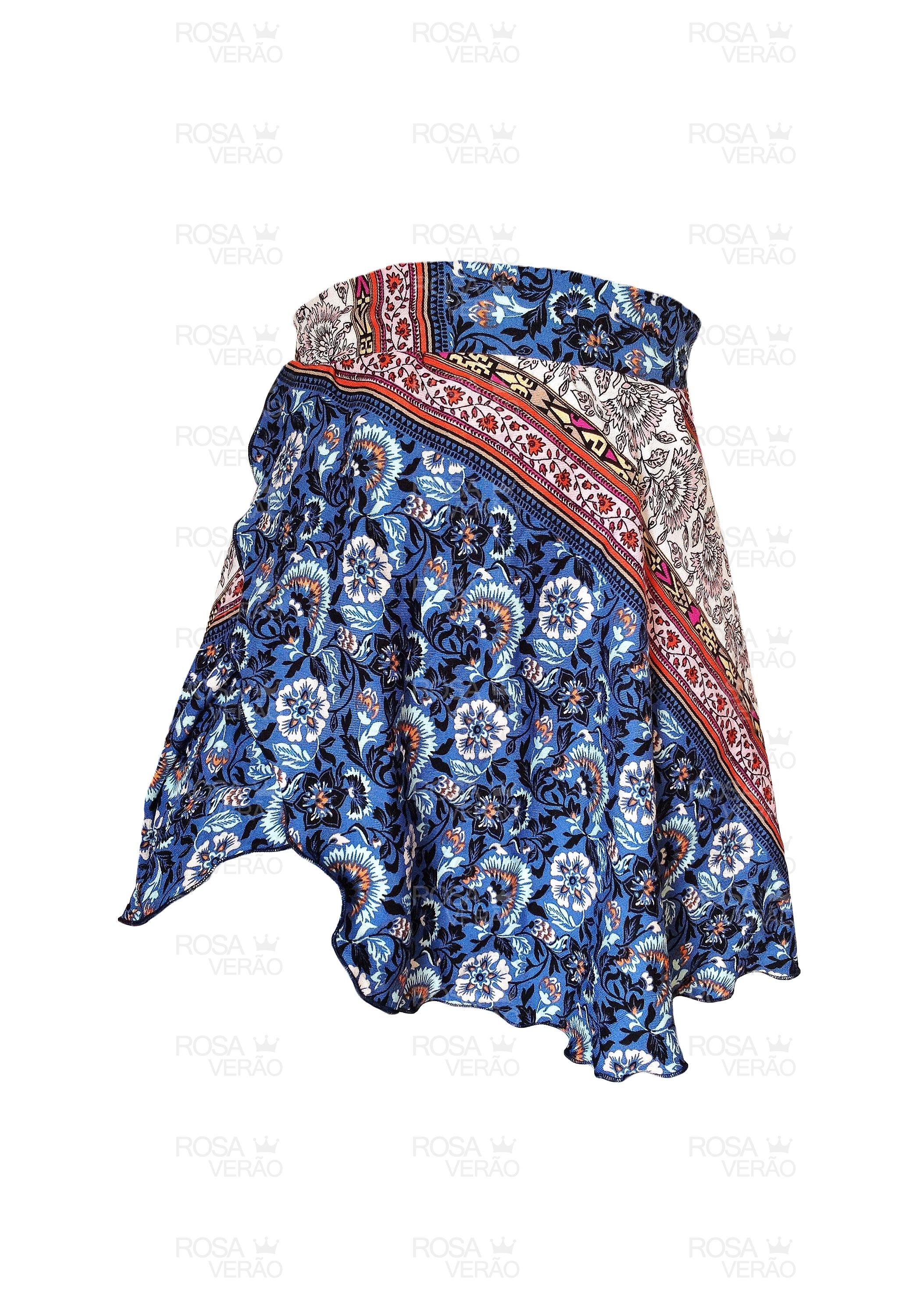 Saia curta transpassada pareô estampa água viva com amarração ajustável. Peça perfeita para usar como saída de praia ou ir para uma baladinha. Modelo acima do joelho.